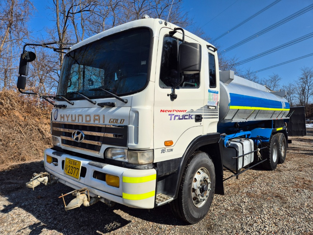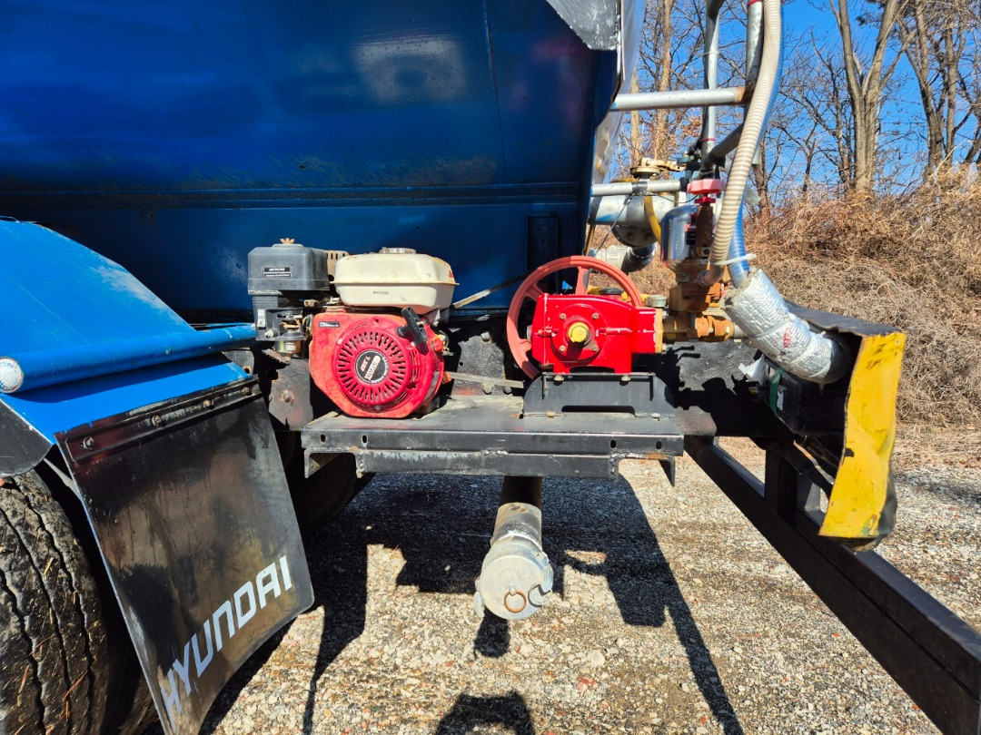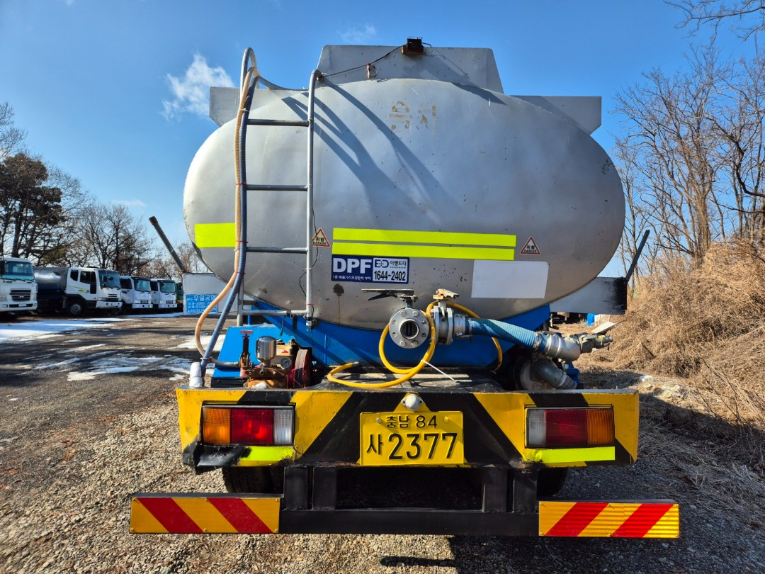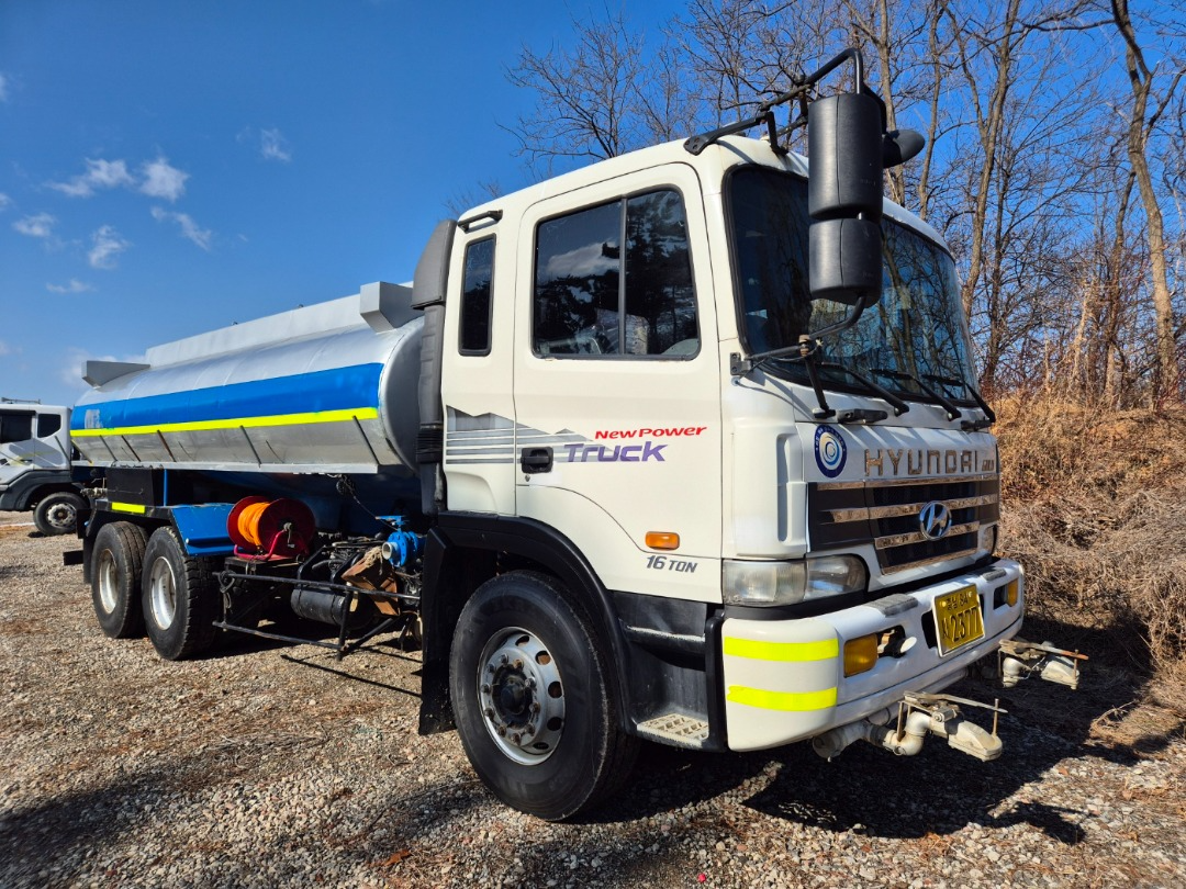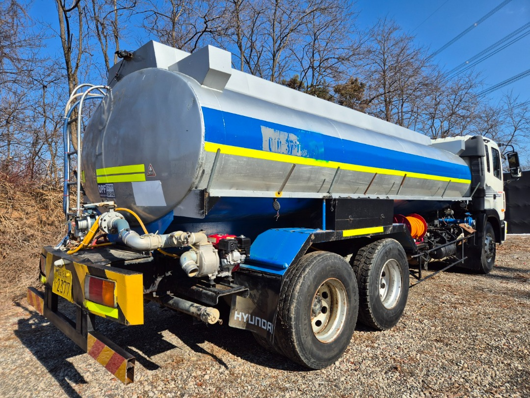 현대16톤단축 스탠탱크 살수차 구변/2002년10월식/충남 60프로 영업용/380 마력/스탠탱크 15.200 리터허가/앞살수 자동릴장착/해청/무연 양수기장착/분무기 장착/매연 여과장치 장착/앞타이어 새것2개장착/충남 60프로 넘버포함(넘버값 별도)/후방카메라장착