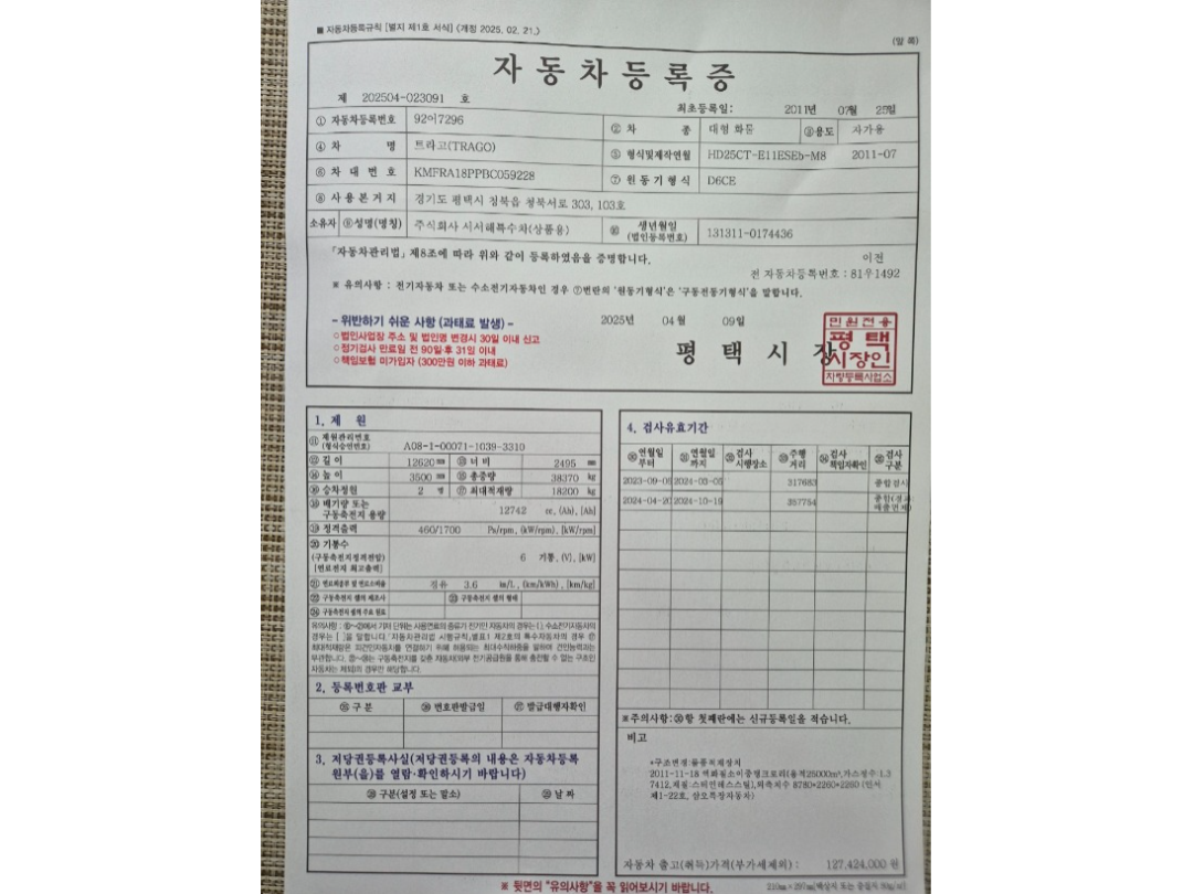 트라고 25톤 카고트럭/2011년7월/460 마력/리타드 장착/에어샾 (쥬브)/적재함 새것 장착/키로수1.368.510 키로/무사고 /엔진 밋션 상태 최상/캐빈 과 하체 도색 중/엔진 보링