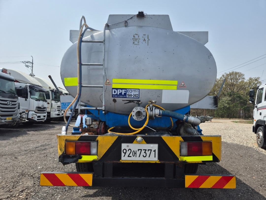 현대16톤단축 스탠탱크 살수차 구변/2002년10월식/충남 60프로 영업용/380 마력/스탠탱크 15.200 리터허가/앞살수 자동릴장착/해청/무연 양수기장착/분무기 장착/매연 여과장치 장착/앞타이어 새것2개장착/후방카메라장착