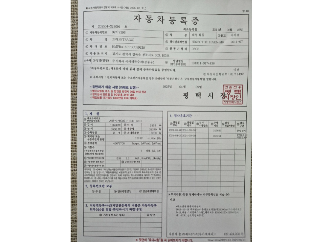 트라고 25톤 카고 트럭 /2011년 7월/460 마력/에어 샾/쥬브/적재함 새것 장착/키로수1.367.754 키로 /엔진 최상/엔진 보링/카고 원형 구변/ 삼발이 디스크 교환/부분 정비 수리 완료/카고 크래인 이나 스크랩 빵통 을 올리셔도 됨니다