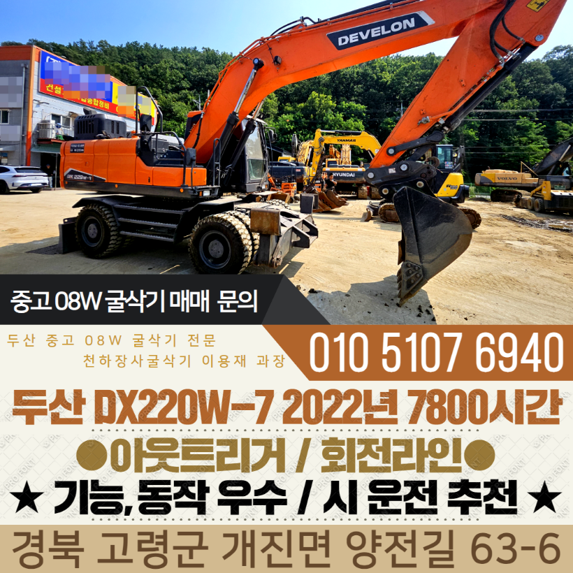 두산 중고 08W 굴삭기 DX220W-7 2022년 7800시간 회전라인 아웃트리거 구성 매매