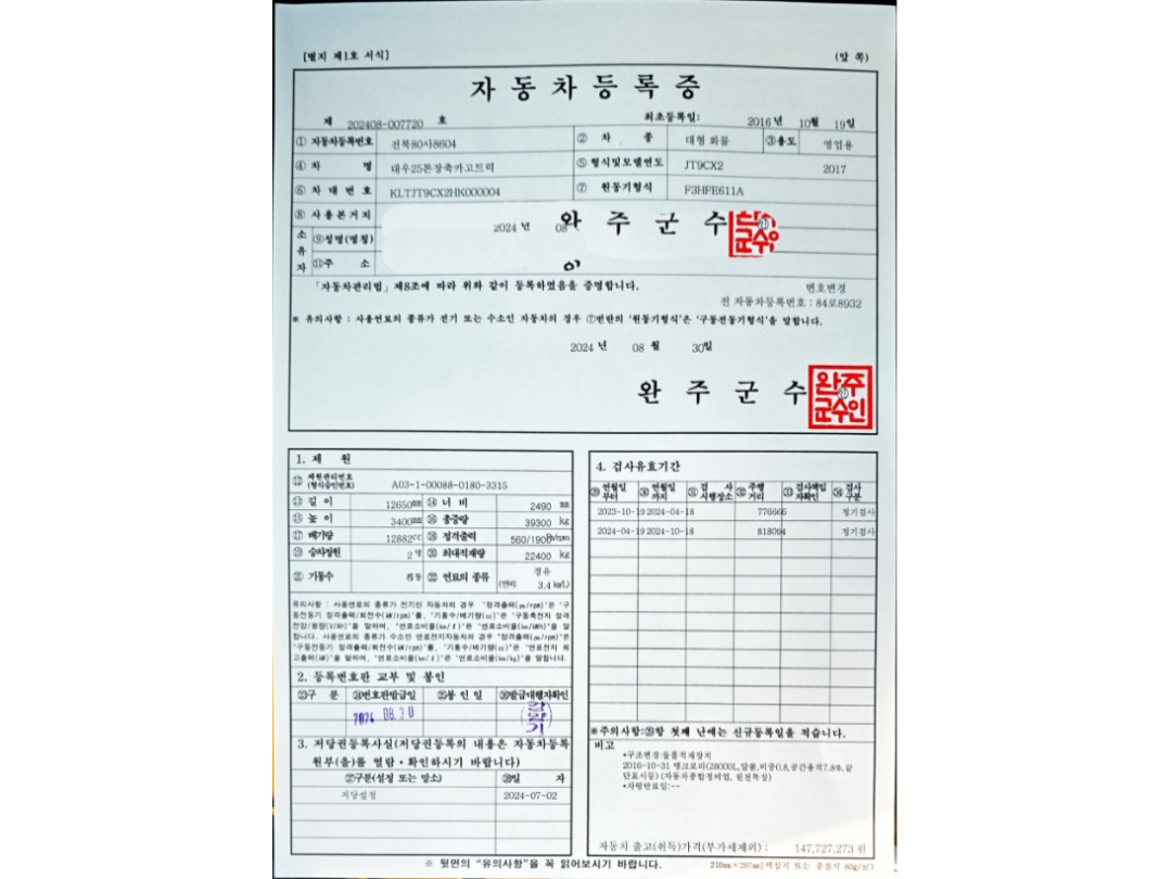 오토 앞축 스텐레스 30,000 리터 이하 화공약품 2016년/11월 832,359km 경기 상품등록 2025.11.20