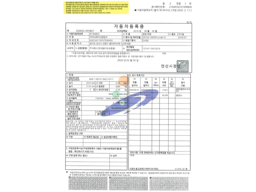 * 차량등록증, 성능점검기록부가 필요하시면 FAX로 보내드립니다.