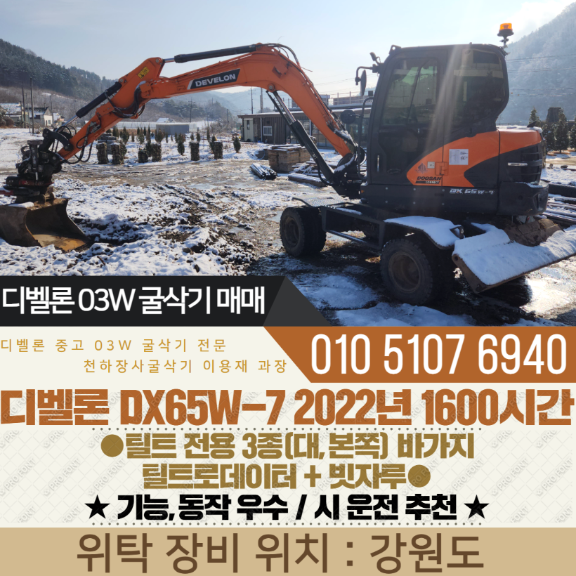 디벨론 03W 굴삭기 DX65W-7 2022년 1600시간 틸트 전용 3종(대,본쪽) 바가지 + 틸트로데이터 + 빗자루
