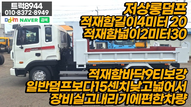 적재함길이4미터20, 적재함넓이2미터30, 적재함바닥9티보강, 일반덤프보다15센지낮고넓어서 장비실고내리기에편한차량입니다