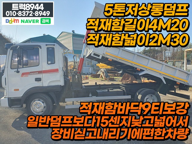 적재함길이4미터20, 적재함넓이2미터30, 적재함바닥9티보강, 일반덤프보다15센지낮고넓어서장비싣고내리기에편한차량