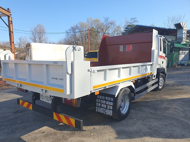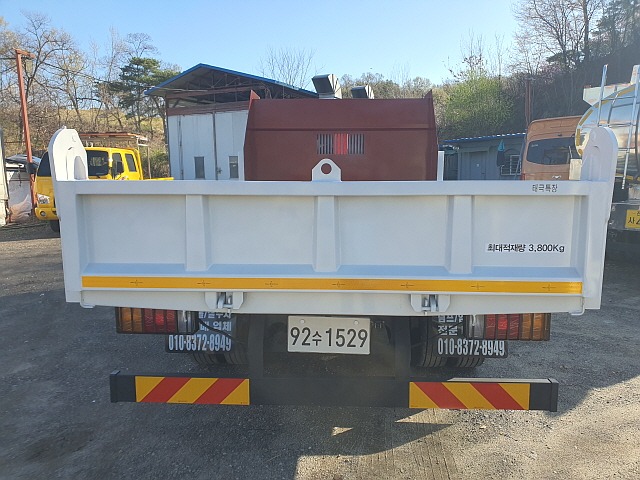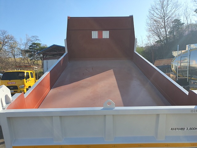 적재함길이4미터20, 적재함넓이2미터30, 적재함바닥9티보강, 일반덤프보다15센지낮고넓어서장비싣고내리기에편한차량